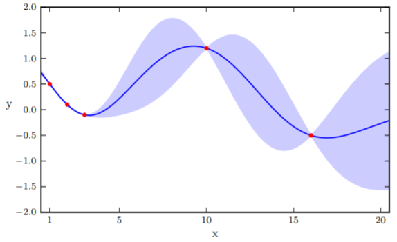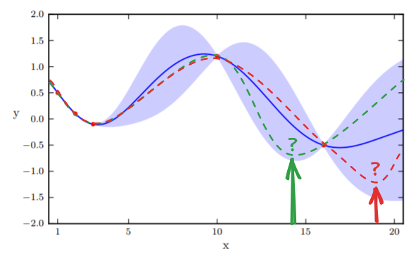 Here, we face a dilemma. In there is a point with the smallest value . Therefore, the next minima should be somewhere close to it. However, it is also possible that points in the wide confidence interval have smaller values than the current minima. To quantify this trade-off, we define an acquisition function to obtain new positions to sample. There are several approaches to define , we are using the Expected Improvement (EI) approach here.
